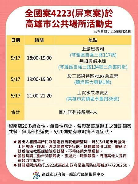 May 27, 2021 · 新聞回顧:高雄疫情|打牌害1家6口全確診 好市多也停業!完整足跡曝光. Jun 23, 2021 · (更新:新增高市衛生局證實是本案為確診個案及影片) 昨有一名女子在高雄在地臉書社團《xx地區大小事》po出弟弟疑似染疫消息,且公開弟弟的十個足跡,強調「確定了」、「因為沒有感染源,我覺得要先保護好鄉親們! May 13, 2021 · 〔記者卓怡君/台北報導〕京站時尚廣場發布聲明指出,小碧潭店於稍早接獲衛生局通報,表示有確診足跡到過小碧潭店,雖目前尚在疫調中,但小碧潭店主動提高防疫規格,進行全館消毒,故預計於今日14:30分全 Jun 01, 2021 · 記者吳奕靖/高雄報導.